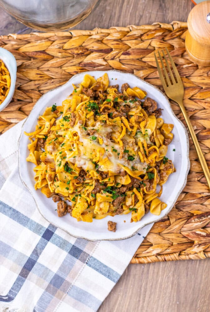 I remember the first time I made something like this. It was one of those nights where the fridge looked a little bare and I needed to stretch what we had into something that felt like a real dinner. Ground beef, some noodles, a packet of soup mix sitting in the cupboard. Nothing fancy. But when it all came together in the skillet with that rich onion flavor and the cheese melted right over the top, it turned into something that felt like it had been planned all along.